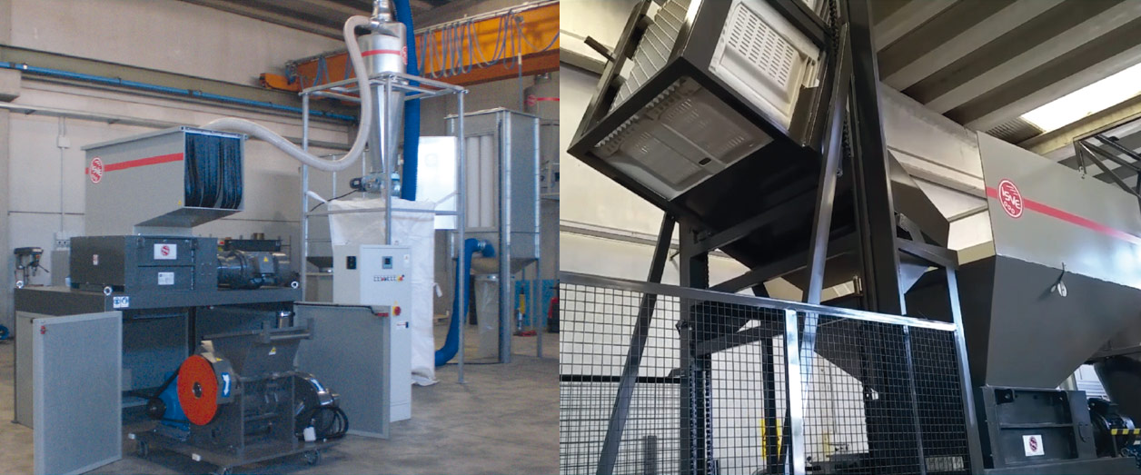 El sistema consta de una unidad de trituración modelo 120/100S en línea con un granulador modelo GR900. Características del triturador: Soporte de chapa de acero electrosoldada de gran espesor; Soportes de cojinetes de rodillos de barril con sistema de sellado contra polvo y líquidos; Placas laterales intercambiables resistentes al desgaste, con espacio intermedio que separa la cámara de corte de las bridas de los cojinetes; Ejes de gran espesor con nº 30 fresas de acero especial antidesgaste y nº 30 discos introductores para facilitar el agarre de cuerpos voluminosos; Espesor de las cuchillas: 40 mm; Disposición escalonada de los dientes de las cuchillas para mejorar el agarre y la progresión del corte; N° 2 reductores epicicloidales con ejes de rotacion