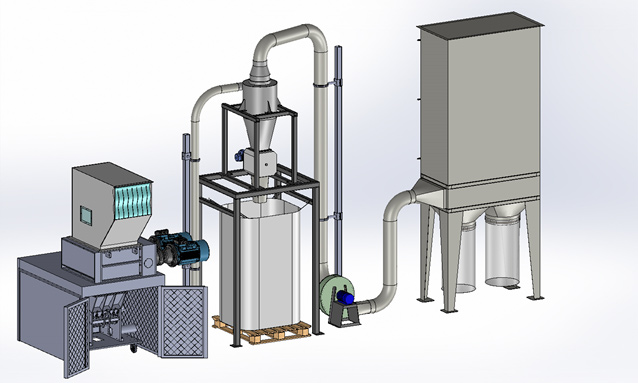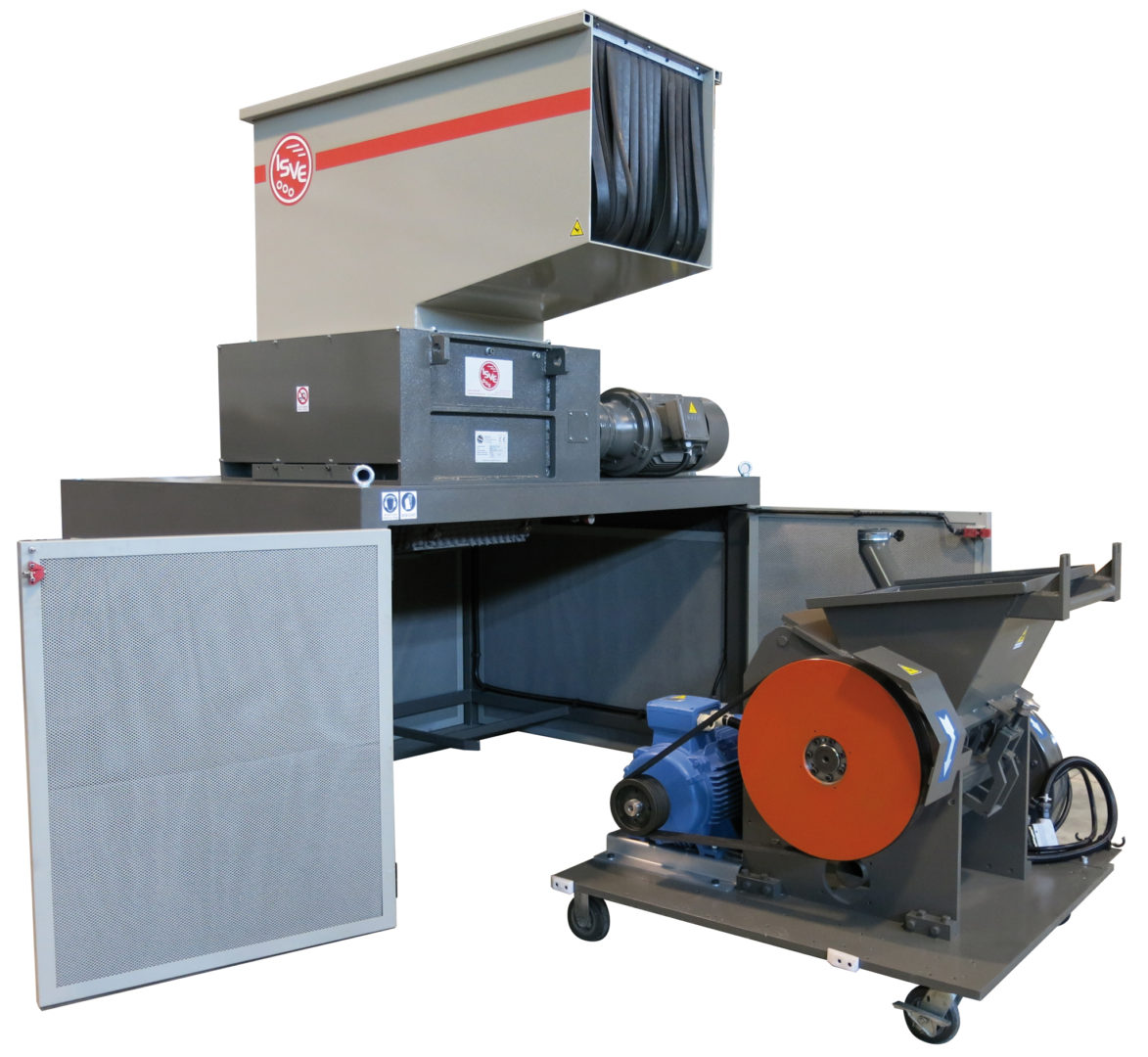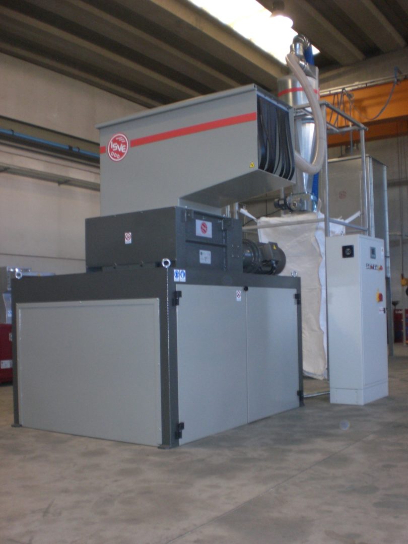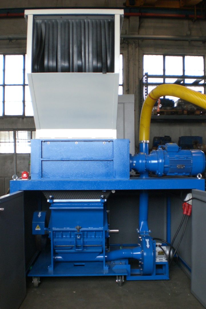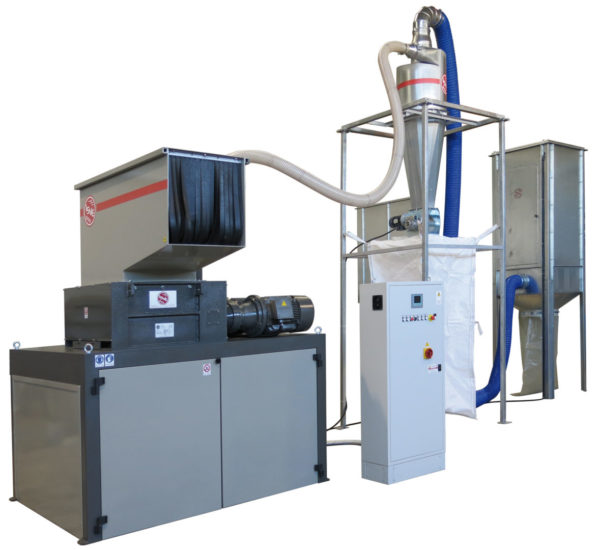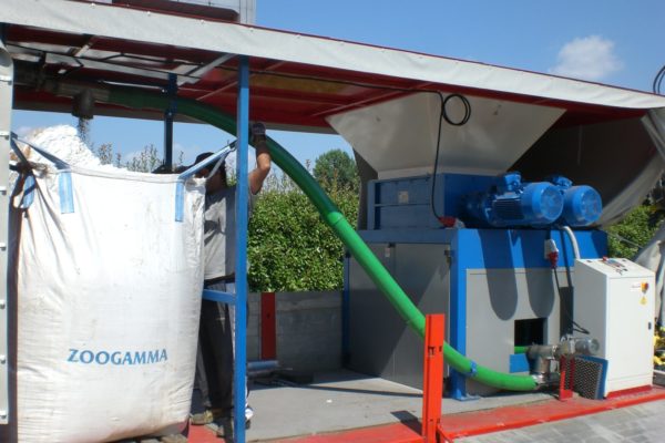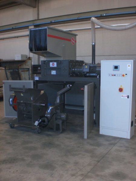 Machines for the reemployment of production waste which combine a 4-shafts shredder and a granulator to get directly pieces of 4-10 mm. Grinding of large materials and remarkable cutting endurance with convenient investment and operation costs. Handled materials: kegs, cans, plastic bowls, car shockproof devices, tanks, rubber, paper, cardboard, polyethylene tapes, PET bottles.