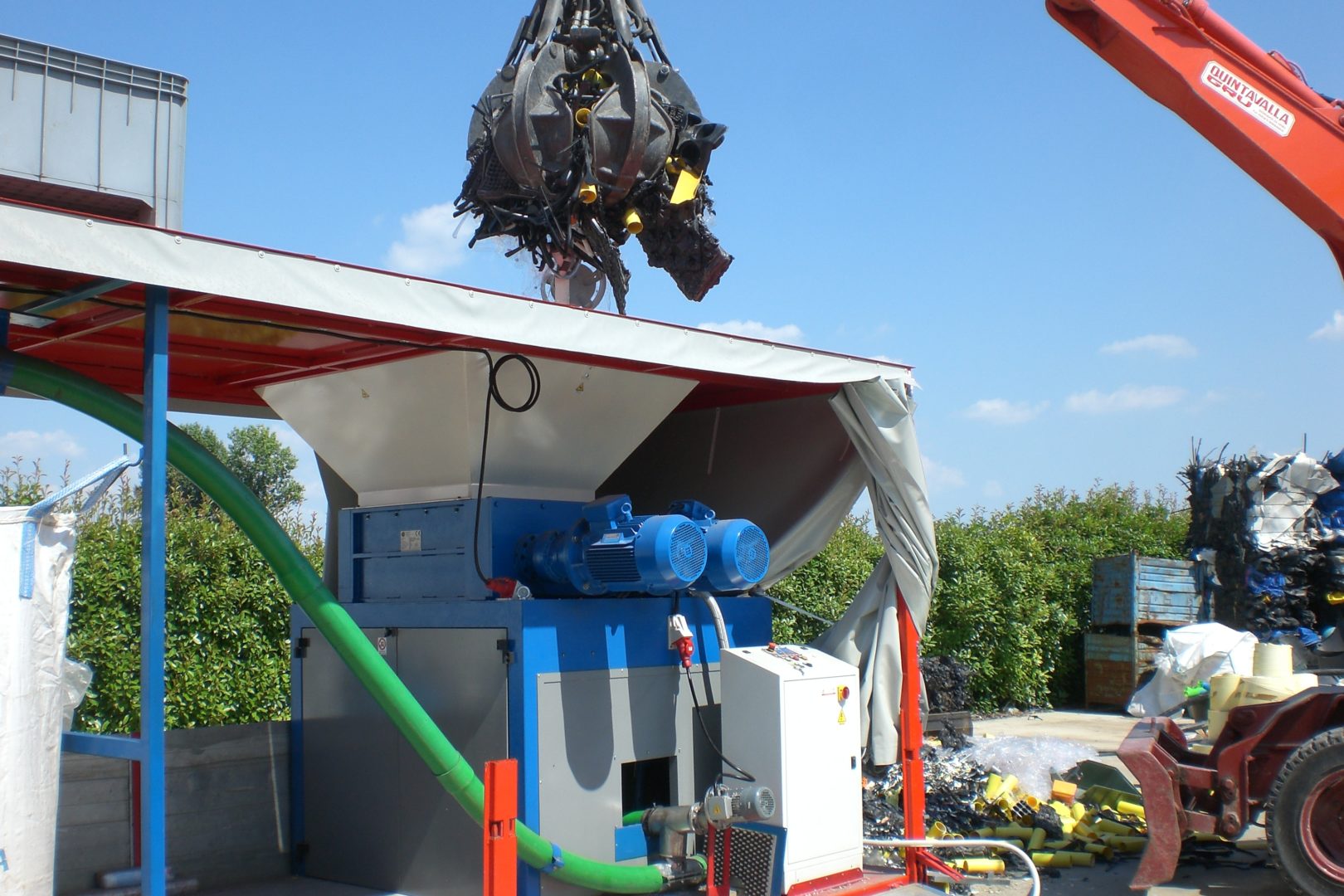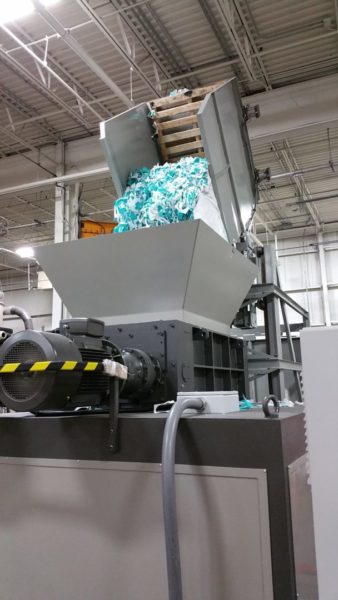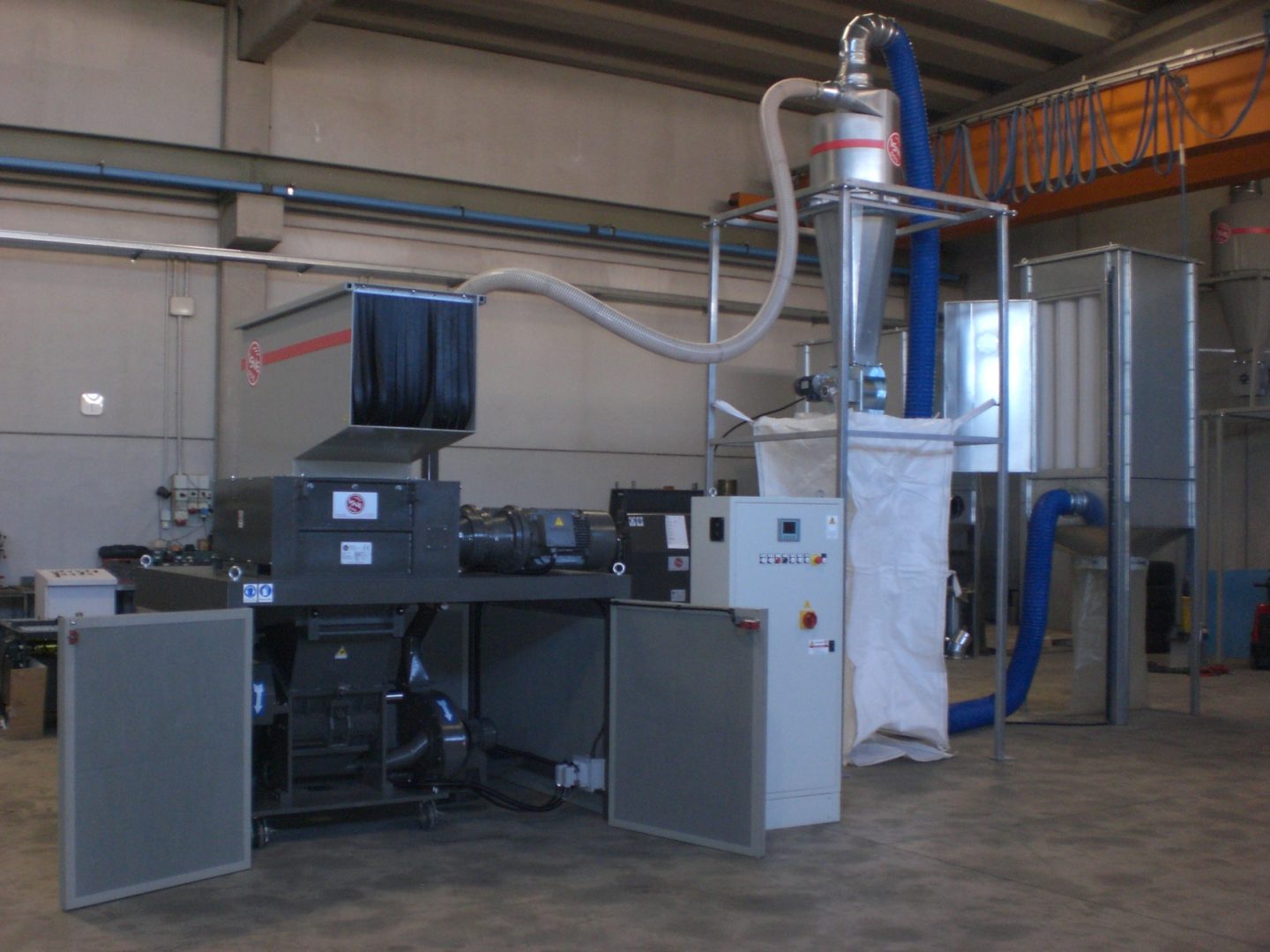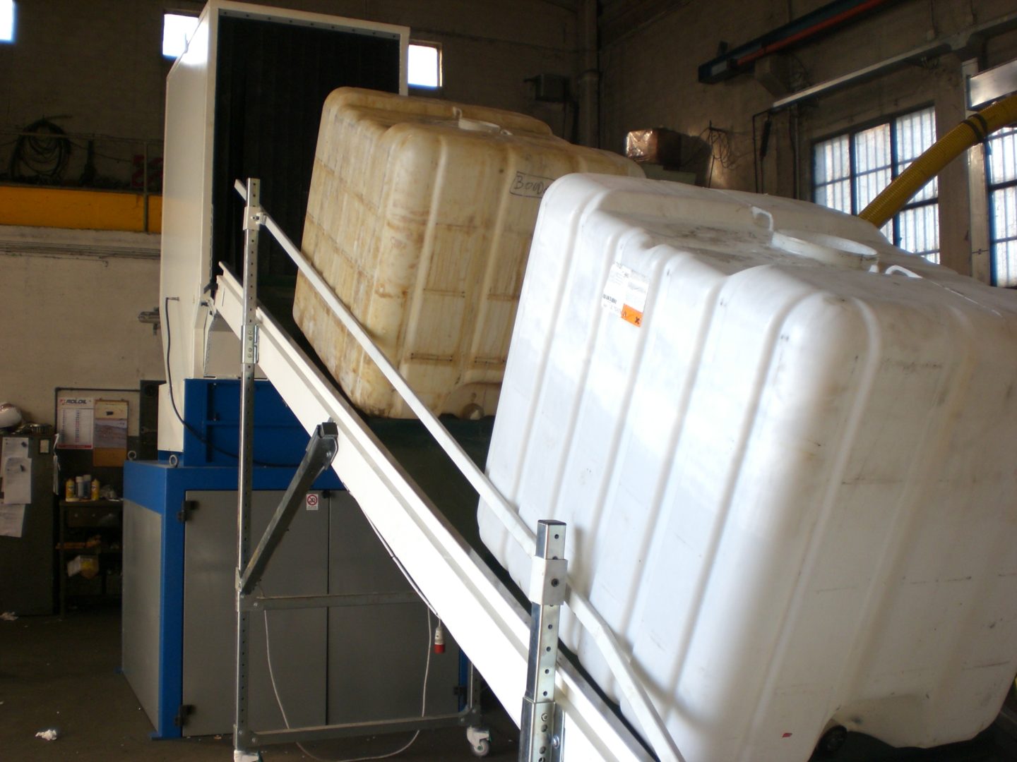 Machines for the reemployment of production waste which combine a 4-shafts shredder and a granulator to get directly pieces of 4-10 mm. Grinding of large materials and remarkable cutting endurance with convenient investment and operation costs. Handled materials: kegs, cans, plastic bowls, car shockproof devices, tanks, rubber, paper, cardboard, polyethylene tapes, PET bottles.