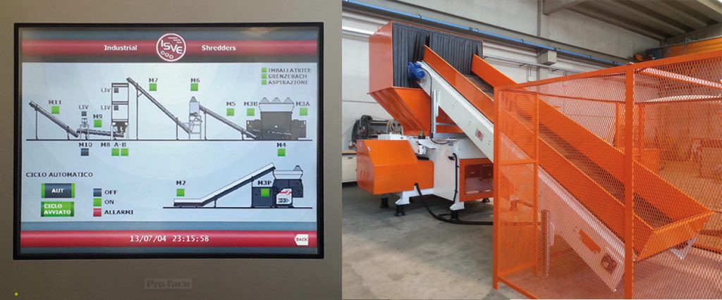 The MS 40-100 IT singe-shaft shredder is particularly suitable to shred high quantities of industrial wastes. The heavy structure makes the machine suitable to realize a heavy use. A hydraulic control unit allows driving the pusher drawer. Thus, the product to be grinded is pushed towards a tools-holder rotor causing its crushing. Thanks to a screen it is possible to select the final dimension of the shredder material. Main features: Power installed on the rotor: 45 kW (60 HP) Power of the hydraulic control unit: 4 kW (HP 5,4) Drive: by belts Number of rotors: 1 Rotor diameter: 400 mm Rotor length: 900 mm Pusher stroke: 800 mm Number of reversible tools: 52 N° of usable tools sides: 4 Upper