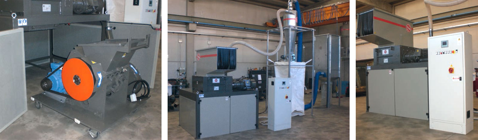 Trituración de cuerpos de gran volumen y notable resistencia al corte con conveniencia en los costes de inversión y de funcionamiento. Materiales tratados: toneles, bidones, jarros de plástico, parachoques auto, mazarotas, goma, papel, cartón, cintas de polietileno, botellas de PET. Un PLC de control regula el funcionamiento de la instalación, haciendo dialogar constantemente el triturador y el granulador.
