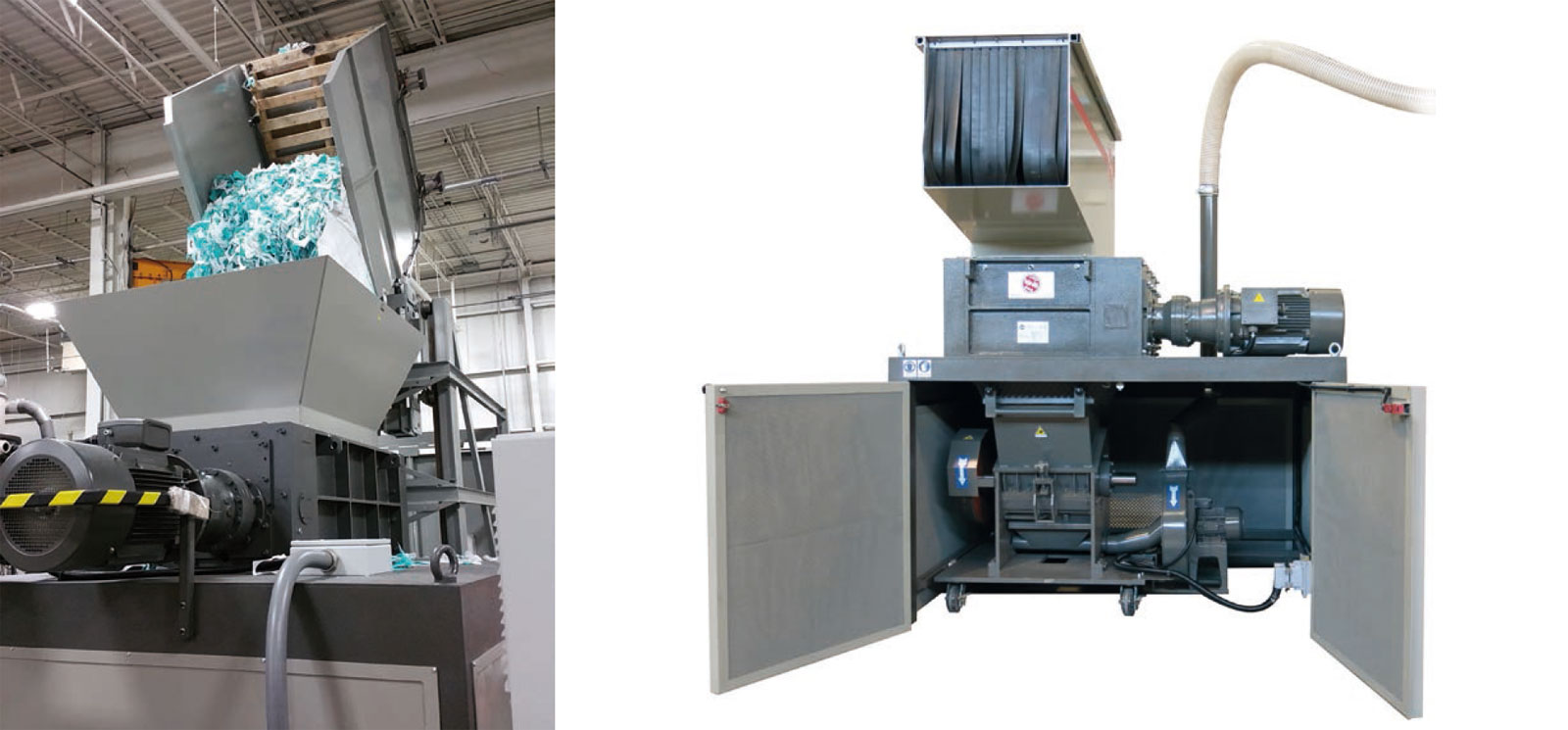 Máquinas para la reutilización de desechos de producción que combinan un triturador de 4 ejes con un molino granulador para obtener directamente piezas de 4-10 mm.