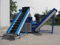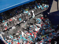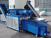 Attraverso un nastro di carico il materiale è convogliato in un trituratore 80/80E a quattro alberi. La macchina provvede alla rottura della bottiglia mentre un nastro a maglie d’acciaio inossidabile provvede alla separazione della frazione liquida dal resto del materiale.