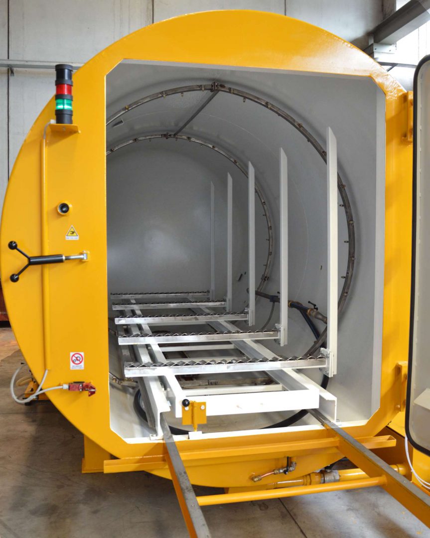 Gli elementi da trattare si caricano in modo opportuno su un telaio mobile (18) provvisto di carro, che viene introdotto nell’autoclave tramite rotaie fissate all’interno nella parte inferiore e superiore.