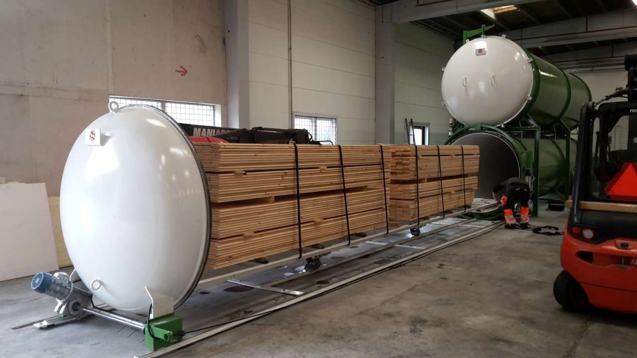 La vasca è destinata al contenimento del liquido impregnante, l’autoclave a quello del legno da trattare, su apposito carrello.